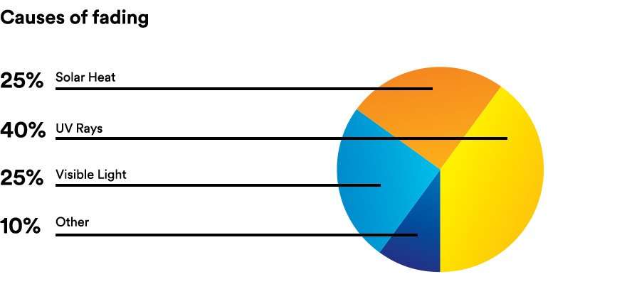 First, let’s discuss what causes this type of fading and sun damage. A common misconception is that the sun’s UV rays are what cause sun damaged floors, furniture and furnishings. While UV rays are certainly the largest component that causes fading, as the chart below illustrates, they actually only account for 40% of the total. Solar heat, or the heat you feel passing through your windows and the visible light streaming through are also major contributors. These factors account for an additional 25% each of the causes of fading. The last factor accounts for the remaining 10% and is listed as “other”. It is comprised of a variety of things that are harder to control like interior lighting, humidity, etc.